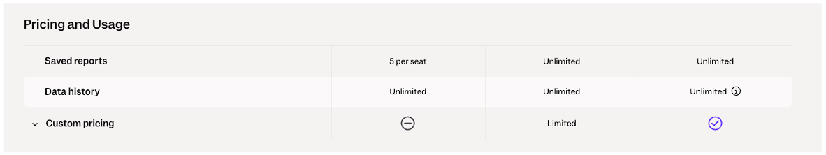 - A seat-based pricing dimension that scales insight outcomes without scaling costs as even volume grows with your business