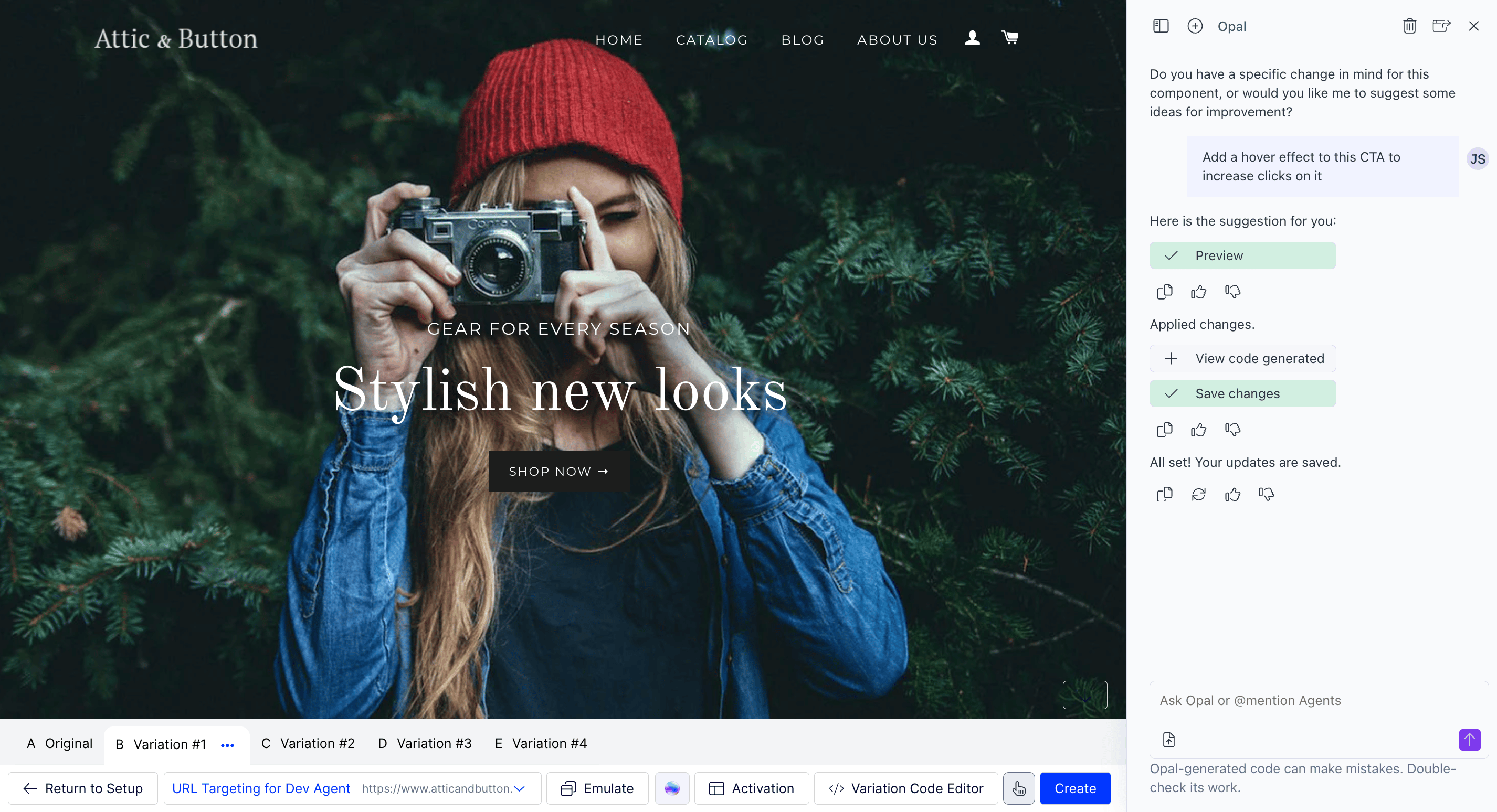 Let Opal help you create and save experience changes with clicks (not code).